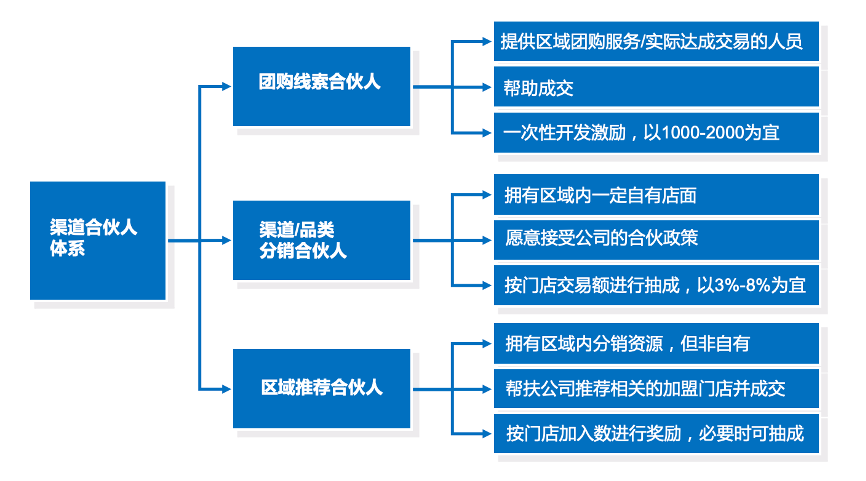 全渠道引流,做活“渠道團購”,助力客戶成交,持續(xù)做多“團購線索合伙人”。專注“大單品創(chuàng)造”,激活品類消費能量,持續(xù)做強“渠道/品類分銷合伙人”。激活區(qū)域分銷資源,讓加盟門店更有活力,讓門店加盟更快,激活區(qū)域資源,持續(xù)做大“區(qū)域推薦合伙人”。三類合伙人,激活區(qū)域渠道價值,全力推動區(qū)域業(yè)績增長。