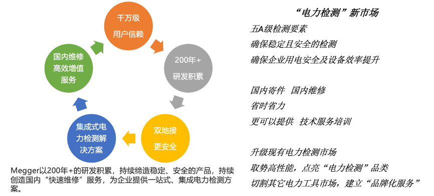 Megger以200年+的研發積累,持續締造穩定、安全的產品,持續創造國內“快速維修”服務,為企業提供一站式、集成電力檢測方案;全面挖掘“5A級要素”,以“強技術”升級2B電力檢測市場。