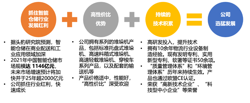 易飛迅經過多年發展,三大競爭動作助力公司迅猛發展。其正是抓住了智能倉儲行業發展的紅利,才擁有了更廣闊的發展空間;正是擁有“高性價比”產品優勢,大大提升了工業品價值;正是擁有了持續的技術積累,才得以推動技術的“快創造”,大大助推公司迅猛發展。
