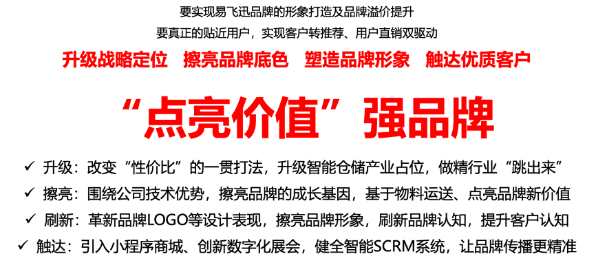 易飛迅對于“鏈接企業用戶打造品牌”的咨詢需求,是基于企業經營大突破及品牌價值再挖掘的表現,是對業績增長、品牌溢價、品牌價值傳遞、企業客戶吸引、小集成區域服務商等問題專業化解決的渴望。其實質是“推動倉儲設備業務升級、品牌戰略升級及提升品牌溢價”的訴求。