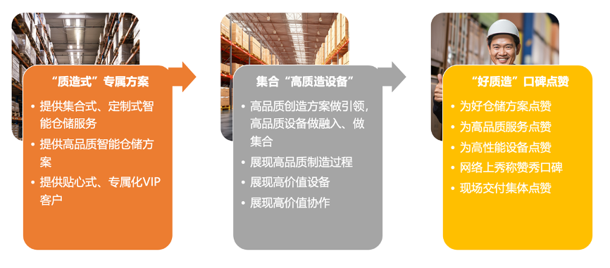 通過“品質制造”,通過貼心式VIP服務,打造“質造式”專屬方案;通過展現高品質制造過程、高價值設備等,集合“高質造設備”,讓“品質制造”更上一層樓;突出“點贊”儀式,細分點贊場景,讓大家為好倉儲方案、高品質服務、高性能設備等點贊,激發用戶的“品質認同感”,真正落地品牌特質。