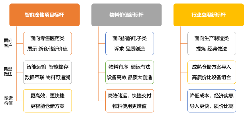 易飛迅積極打造“三大標桿”,面對不同行業,分別建立“智能倉儲項目標桿+物料價值新標桿+行業應用新標桿”,以“三大標桿”塑造品牌大價值。