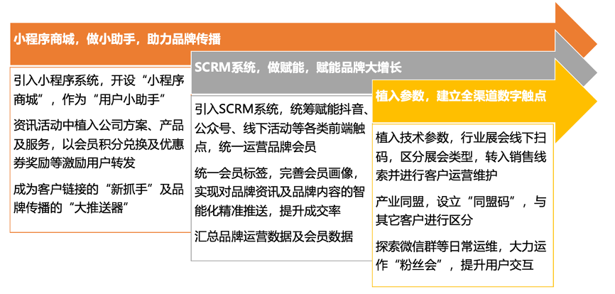 韜慧咨詢認為,工業品品牌傳播,已經是數字化技術驅動下的新品牌策劃傳播,沒有智能SCRM系統,品牌粉絲運營就無法推進,客戶資訊推送、主題精準營銷等就無法推進;沒有“小程序商城”,工業品會員積分兌換及獎勵刺激等就無法展開,客戶數據匯總無法有效匯總;沒有各類參數及二維碼,就無法分類匯聚全渠道數據,無法推動“工業品潛力客戶挖掘”,無法建立全渠道數字觸點。