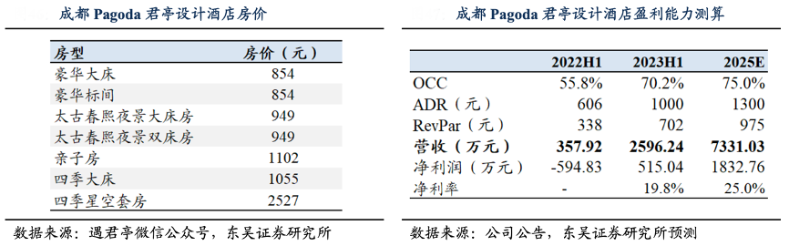 經(jīng)典案例:根據(jù)遇君亭微信公眾號(hào)、公司公告、東吳證券研究所等綜合資訊表明,成都 Pagoda 開業(yè)以來獨(dú)特的設(shè)計(jì)風(fēng)格吸引大量顧客打卡,小紅書上成都 Pagoda 酒店 tag 熱度達(dá) 17 萬次瀏覽。2023 年 H1,成都 Pagoda 實(shí) 現(xiàn)營業(yè)收入 2596.24 萬元,RevPAR 為 702 元,同比+108%。